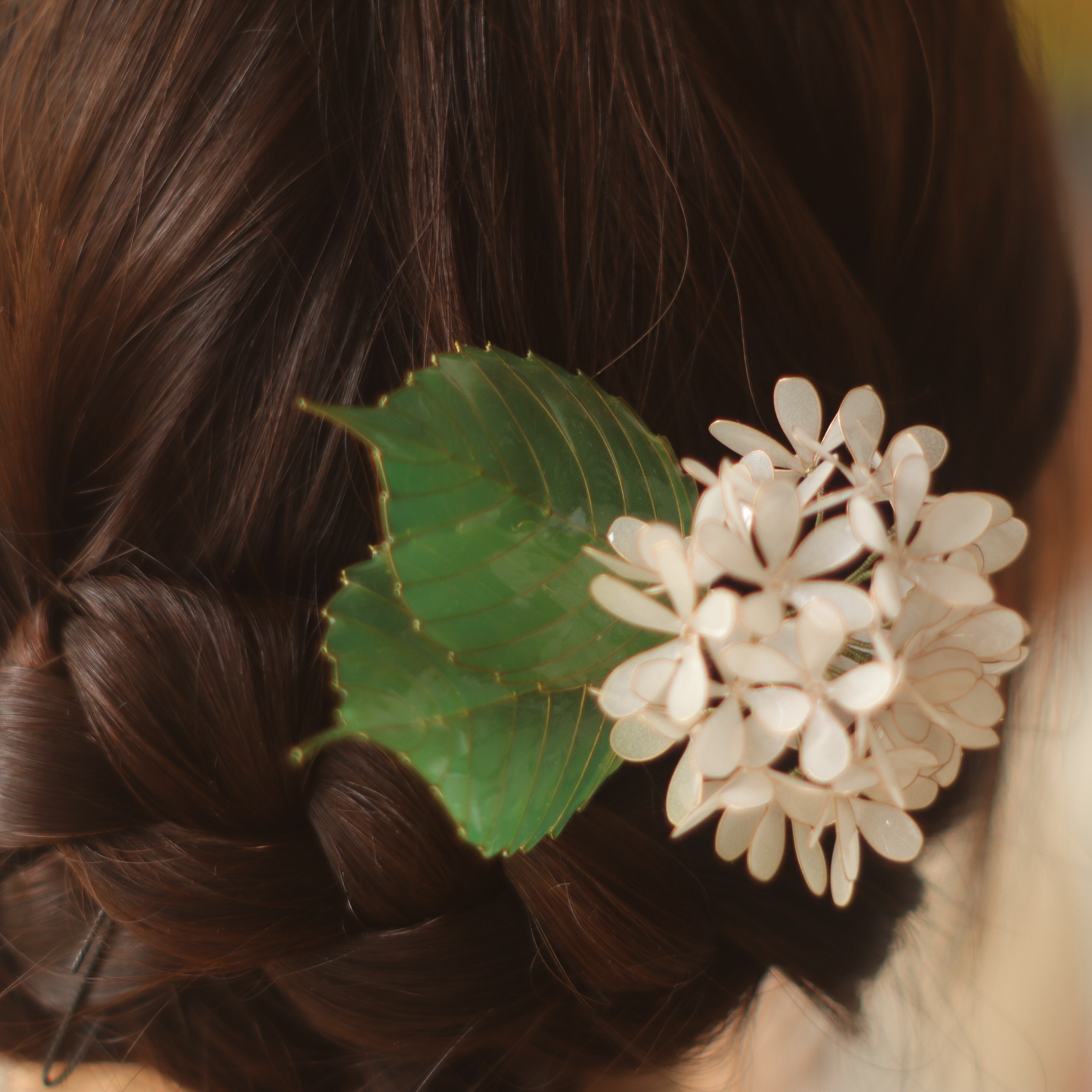 真っ白な花と緑の葉っぱが可愛らしい髪飾りです。